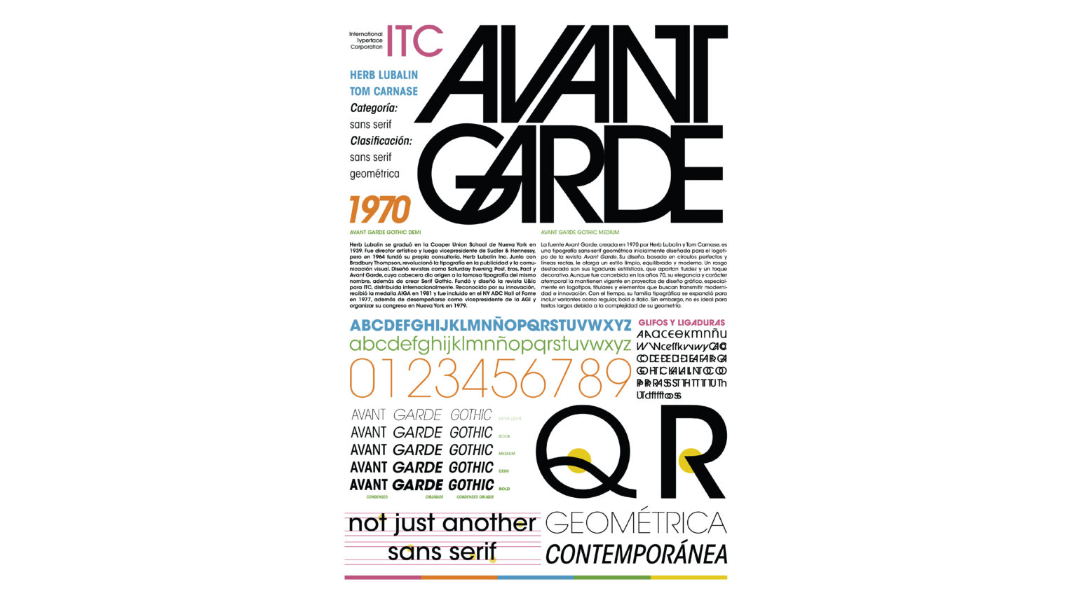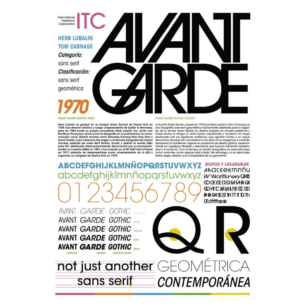 Este proyecto consiste en la elaboración de un espécimen tipográfico dedicado a la fuente ITC Avant Garde Gothic, una tipografía geométrica desarrollada en los años 70 por Herb Lubalin y Tom Carnase. El objetivo del trabajo fue explorar las características formales, el contexto histórico y las posibilidades expresivas de esta tipografía, destacando su vínculo con el movimiento modernista y su aplicación en el diseño editorial y publicitario.
